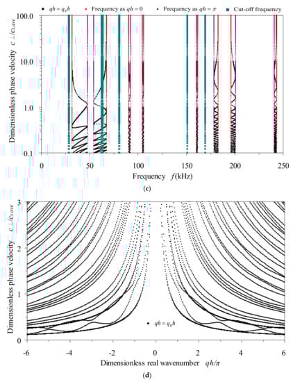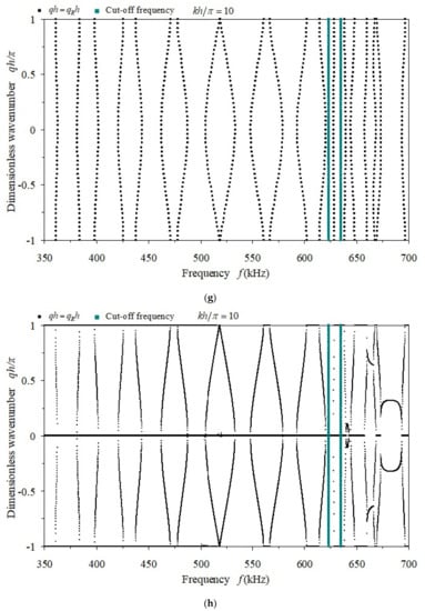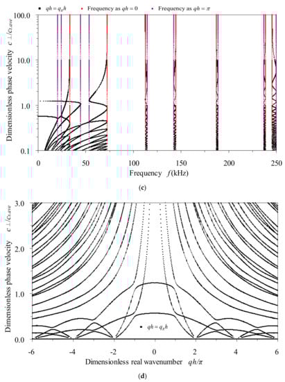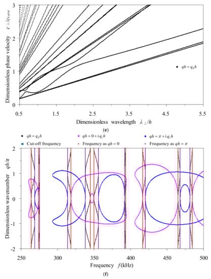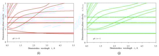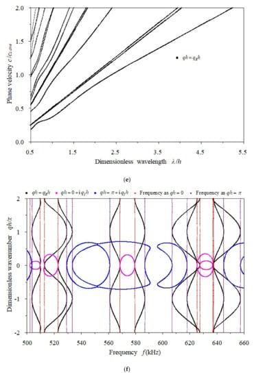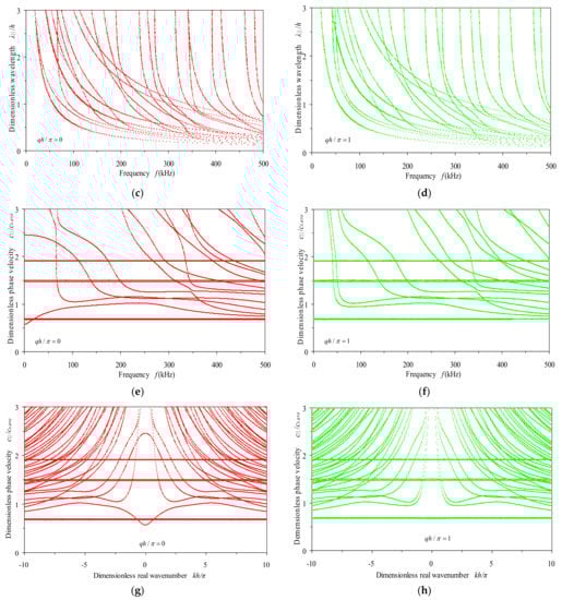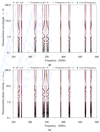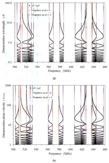 As mentioned above, the Floquet in-plane waves propagating obliquely to layering in periodically multilayered isotropic media should be coupled P-SV waves. When the wavenumber parallel to layering is specified as , for example, all kinds of the dispersion curves representing the characteristics along the thickness of the exemplified periodically octal-layered and bi-layered media can be drawn, as shown in Figure 7 and Figure 8, respectively. The frequency-related dispersion curves in low and high frequency ranges are shown in sub figures (a)–(c) and (f)–(h), respectively, and the other phase velocity-related dispersion curves are shown in sub figures (d) and (e).