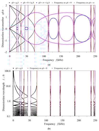 The frequency-related comprehensive dispersion curves in low and high frequency ranges, including the frequency–wavenumber spectra, the frequency–wavelength spectra, and the frequency–phase velocity spectra, all directly reflect the frequency band characteristics. While the other dispersion curves (including the wavenumber–phase velocity curves and the wavelength–phase velocity curves) do not directly reflect the band characteristics. These features are common to the comprehensive dispersion curves of various elastic waves in all kinds of periodic structures [,,,,,,,,,,,,,,,,,,,,,,,,,,,,]. Here we summarize the characteristics of comprehensive dispersion curves of pure P and pure SV waves in general periodically multilayered isotropic media along the thickness direction as follows.