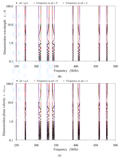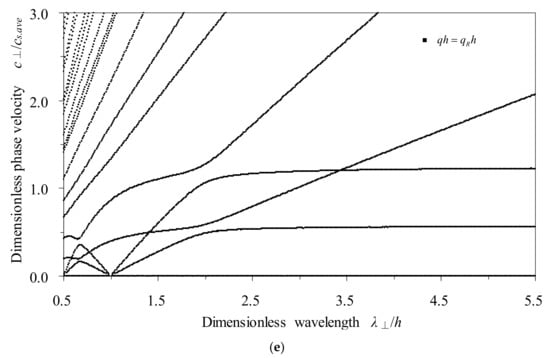 As elastic waves propagating along the direction perpendicular to layering are considered to correspond to , they should be pure P and SV waves. The dispersion curves of the exemplified periodic octal-layered isotropic media related to the frequency including the frequency–wavenumber, frequency–wavelength, and frequency–phase velocity spectra, are shown in Figure 4a–c and Figure 5a–c in the low and high frequency ranges, respectively. Those corresponding dispersion curves related to the phase velocity, such as the frequency–phase velocity, the wavenumber–phase velocity, and the wavelength–phase velocity curves are shown in Figure 4c–e, respectively.