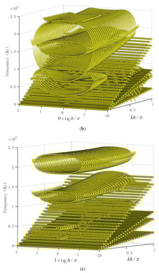In order to clarify the relationship between the frequency and two wavenumbers, which are components along the layering direction and along the thickness direction , the dispersion surfaces of both real wavenumbers and of imaginary wavenumbers along the thickness direction are considered and are given in Figure 9 over a certain frequency range. The dispersion curves are actually the cutting profiles of the dispersion surfaces. In Section 5.2, they correspond to the profile section at , while in Section 5.3 they correspond to the section at or , respectively. Similarly, the dispersion curves in Section 5.4 correspond to the section at . From the dispersion surfaces, the variation trend of the wavenumbers in passbands and the stopbands on the frequency can be easily observed.