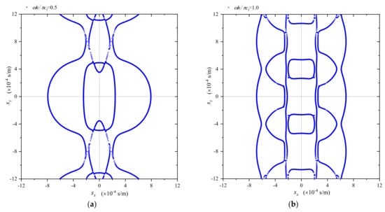 In order to further illustrate the propagation characteristics of in-plane waves along all in-plane directions in periodically multilayered isotropic structures, the slowness curves at given frequencies are obtained in Figure 10 for the exemplified periodic octal-layered media. The dimensionless frequency is applied with , where is the phase velocity of the longitudinal wave. The slowness curves with fixed frequencies are periodically distributed in the thickness direction, and the period of slowness component in the thickness direction equals due to . In the formula, is given and is constant, and is periodic with its minimum positive period as . Thus, the period decreases with the increasing of the frequency. Moreover, the higher the dimensionless frequency is, the more slowness curves will appear.