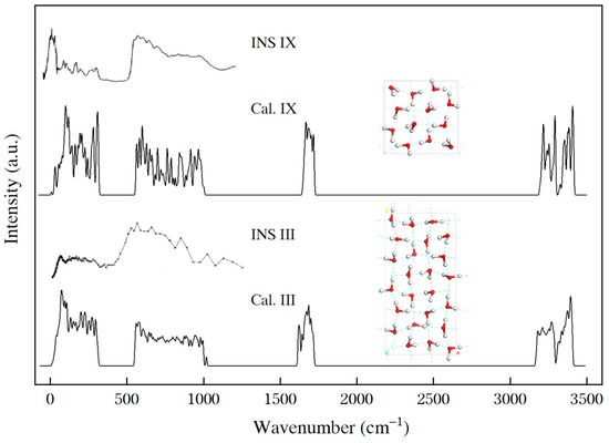 Comparisons of the experimental INS spectra (“INS”) [16,26] and the calculated PDOS curves (“Cal.”) of ices IX and III. The inserts show the structures of the primitive cells.