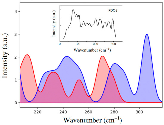 Fitted distribution curves of the four-bond modes (blue) and two-bond modes (red) of ice III from 200 cm−1 to 320 cm−1. The inset is the overall PDOS curve in the translation band.