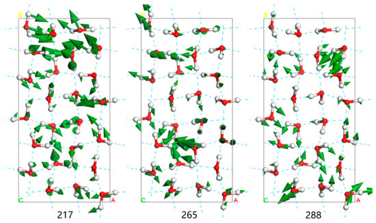 To determine the two kinds of HB vibrational modes in ice III, we employed a self-compiled program to classify the normal modes in the translation band [19]. The criterion for classification is based on the included angle between the vibrational direction and the H–O–H angle bisector. As shown in Figure 2, the HB vibrational modes are categorized into two groups: two-bond modes and four-bond modes. If we sum the two curves, the result largely matches the PDOS. The two curves both show energy splitting at above 200 cm−1. Thus, all the phonons show a superposition band without two characteristic peaks as in ice Ih. Figure 3 presents three example modes, of which the mode at 217 cm−1 is a two-bond vibration, and the other two are four-bond vibrations. To observe the dynamic processes, please see the three animations in the Supplementary Materials.