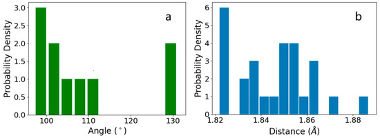 Notably, the mixed HB vibrational modes lead to a broad overlapping zone below 280 cm−1. Because the HB strength is determined by the bond length and included angle [29], we analyze the intramolecular HB bond lengths and the included angles between HBs around one central molecule in the tetrahedron, as presented by the distributions in Figure 4. The included angles are divided into two groups at and 130° (109°28′ in an ideal tetrahedron), and the bond lengths range from 1.82 Å to 1.89 Å (1.79 Å to 1.87 Å in ice Ic [21]). This demonstrates how high pressure deforms the tetrahedral structure of ice III. Similar to our previous discussions on ice V [30], the tetrahedral symmetry in ice III is remarkably distorted by this high pressure. Unlike the six-membered rings that exist under atmospheric pressure, five-, seven-, and eight-membered rings occur in ice III [31]. Moreover, the five-membered rings combine to form bicyclo-heptamers [32]. The broad distributions of bond lengths and deformed angles result in various HB strengths. This is the origin of the energy splitting in both the two-bond and four-bond modes. By comparison, ice IX, the H-ordered counterpart of ice III, has two relatively well-defined HB peaks, as shown in Figure 1. This is because the simple primitive cell of ice IX reduces the phonon complexity, making the spectrum simpler to interpret.