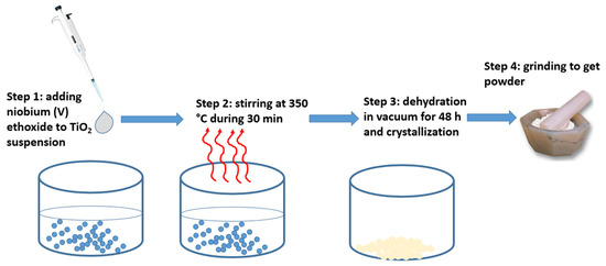 Commercial anatase TiO2 nanopowders made from nanoparticles with an average diameter of 5 nm were purchased from Skyspring Nanomaterials (product ID: 7930DL, Houston, TX, USA). Niobium (V) ethoxide was purchased from Sigma-Aldrich (CAS number 3236-82-6), Schnelldorf, Germany. As shown in Figure 1, the method of synthesis consists of four steps: (1) dropping different volumes of niobium ethoxide in a suspension of TiO2 nanopowders with a different molar ratio of Nb(x)/TiO2 (x = 0.0, 0.2, 0.5, 2%), (2) stirring the solution at 350 °C during 30 min, (3) dehydrating and crystallization of the gel in a vacuum chamber for 48 h, and (4) grinding with a mortar to obtain fine powders of Nb(x)/TiO2.