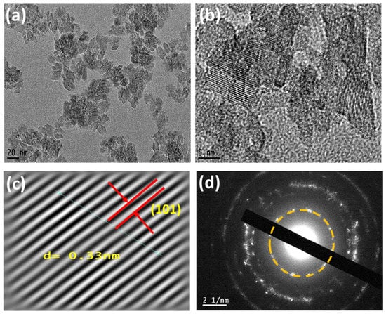 (a,b) TEM images, (c) HRTEM image, and (d) SAED pattern of 5 nm TiO2 nanoparticles.