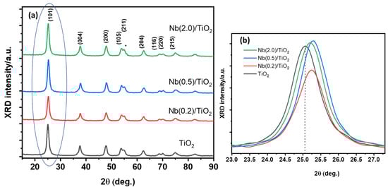 (a) XRD patterns of Nb(x)/TiO2 samples with different molar fractions of niobium (0, 0.2, 0.5, and 2%), and (b) shift of the crystal plane (101) due to the effect of Nb. The peak marked by an asterisk * belongs to niobium oxide.