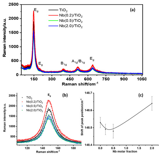 Figure 4a shows the Raman spectra of pure Pure TiO2, Nb(0.2)/TiO2, Nb(0.5)/TiO2, and Nb(2.0)/TiO2. We can observe the six basic Raman active modes for the anatase phase correspond to (Eg), 196 (Eg), 396 (B1g), 515 (A1g), 519 (B1g), and 638 (Eg) [26,27]. The very low blue shift of the Eg mode 148 cm−1 relative to the bulk mode is due to the effect of the small size on the phonon confinement [28]. Figure 4b shows the fitting of the Eg mode located at 148 cm−1 with a Lorentzian function; it is seen that the shift of the peak is not significant. We plotted the variation of the Raman shift of the Eg mode as a function of the molar fraction of Nb. Figure 4c clearly shows the plot when the molar fraction varies between 0.5 to 2; a very small effect of Nb on the TiO2 vibrational mode can be concluded. This effect may be ascribed to the surface adhesion between the two molecules or surface mismatching. However, this shift can be ignored, where it has a difference in wavenumber of ~0.15 cm−1. Thus, the tendency is not well-considered and can be also ignored.