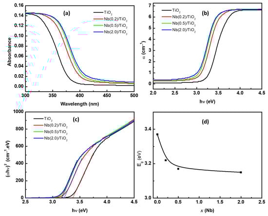 The optical properties of the fabricated nanocomposites are important to understanding the limitations of the excitation energy. The photon energy is absorbed by the electrons in the valence band, and then the electrons jump to the conduction band, leaving the holes behind. The photon energy absorption is determined by the electronic band structure. The light absorption efficiency is indicated by the band gap of the nanocomposite. The measured absorbance (A) and the calculated absorption coefficient (α) for solid Nb(x)/TiO2 nanocomposites are shown in Figure 5a,b. A red shift was observed due to the addition of Nb to the TiO2. However, it shows a band edge with the direct transition. Thus, Equation (1) was used to determine the optical band gap, Eg [29]: