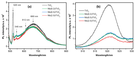 The photoluminescence measurements were performed at room temperature using a He-Cd laser (wavelength 442 nm, output laser power 20 mW) as an excitation source, a grating 1800/mm, and an objective with a magnification of 50× to record the PL spectra. The excitation and collection were measured in a backscattering configuration. Figure 6a shows PL spectra of Nb(x)/TiO2 where different emissions are observed at different wavelengths. In the four samples, we observe the same PL emission peaks located at 520 nm, 540 nm, 612 nm, and 660 nm. The peaks emitted at 520 nm, 540 nm, and 612 nm could be due to the deexcitation from lower vibronic levels in the oxygen vacancies of the TiO2 lattice to the ground state [31]. These emissions are mostly a surface phenomenon as a result of the large surface area of the nanoparticles being very sensitive to any change in the surface environment. The large band emitted at 660 nm corresponds to radiative emission between trapped electrons and valence band holes caused by the recombination of photogenerated holes with electrons occupying states below the Fermi level before the laser excitation [15].