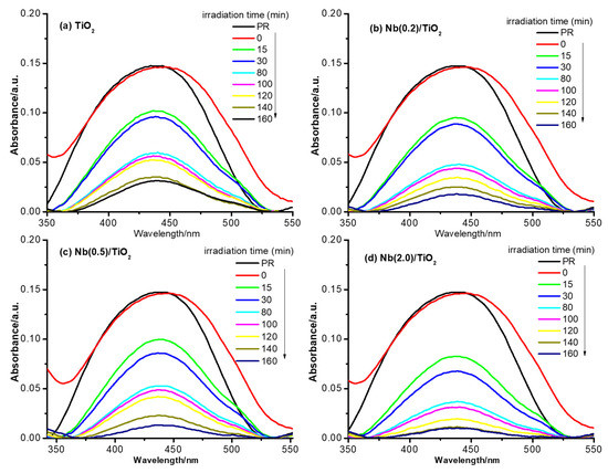 Absorbance spectra of the degradable phenol red at various irradiation times for TiO2, Nb(0.2)/TiO2, Nb(0.5)/TiO2, and Nb(2.0)/TiO2.