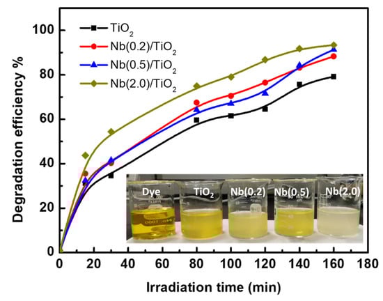 The unique optical properties put these nanocomposites in the category of competitive catalysts. Nb(x)/TiO2 nanocomposites with their broadband gap and high excitation binding energy are promising materials for the degradation of organic dye pollutants [32]. Figure 8 shows the degradation efficiency of 20 mg/L phenol red through 5.0 mg of Nb(x)/TiO2 at various irradiation times. The efficiency was calculated by the following equation: