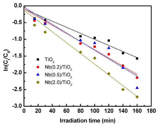 where and are the basic concentration of the phenol red and the instant concentration after a certain irradiation time. This semi-logarithmic equation results in a straight line, as shown in Figure 9. The constant of the adsorption equilibrium can be calculated from the intercept part, and the constant of the first-order reaction can be calculated from the slope part [35,36]. Their values are listed in Table 1. The values of both constants are dependent on the presence of Nb on the nanoparticles, where k increased from 0.01 for TiO2 to 0.19 for Nb(2.0)/TiO2 nanocomposite, while K decreased from 0.63 to 0.08 for the same nanocomposites. These results reveal the large effect of the existence of niobium on the degradation reaction. The degraded amount ( of the phenol red on the surface of the oxide materials at equilibrium at an irradiation time of 160 min is known as the amount of dye (in mg) per unit mass of oxide (in g), i.e., in mg/g, and was estimated as follows [37]: