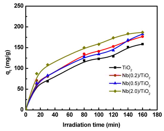 where is the instant phenol red concentration. The amount of degraded phenol red as a function of irradiation time is shown in Figure 10, which indicates the adsorption capacity dependence. The adsorption capacity was improved with increasing the time, as with the photocatalysis efficiency curve observed in Figure 8. The capacity of the Nb(2.0)/TiO2 nanocomposite is higher than the others.