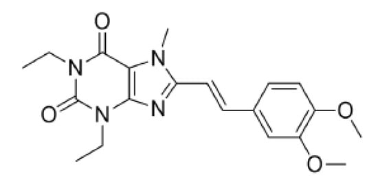 The adenosine A2A-receptor is closely related to Parkinson’s disease (PD). A suitable antagonist could enhance the function of dopamine on D2 receptor neurons and result in some anti-Parkinson’s effect [1,2,3,4,5,6]. Istradefylline (Figure 1) (KW-6002, (E)-8-(3,4-dimethoxystyryl)-1,3-diethyl-7-methyl-dihydro-1H-purine-2,6-dione) is the first approved adenosine A2A-receptor antagonist that can improve the motor function of PD patients through its neuronal activity [7,8]. Moreover, it has also received extensive attention in pharmacology. Istradefylline was reported as a promising drug for movement disorders treatment [9]. In addition, Shin-ichi Uchida reported that istradefylline enhances the anti-parkinsonian activity of low doses of dopamine agonists [10,11,12,13].
