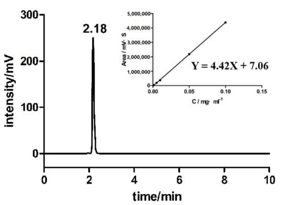 A perfect chromatogram of istradefylline as a symmetrical sharp peak was obtained, as shown in Figure 2. The relationship between the chromatogram peak area and concentration expressed as calibration curve is graphically displayed in Figure 2. The linear fitting equation was Y = 4.42X + 7.06 with a concentration range of 0.001 mg·mL−1 to 0.1 mg·mL−1, while the linear dependence was 0.9999. The linearity was used to calculate the istradefylline concentration in the supernatant of each vial in the experiment by HPLC detection.