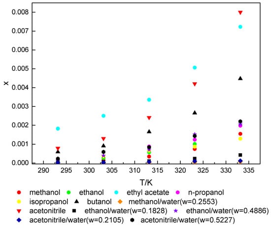 Temperature dependence of mole fraction of istradefylline in several solvents.