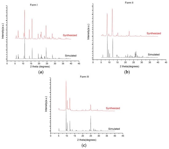 Comparison of powder X-ray diffraction (after grinding) and crystallographic data of istradefylline. (a) Form I made in ethanol; (b) Form II made in methanol; (c) Form III made in acetonitrile.