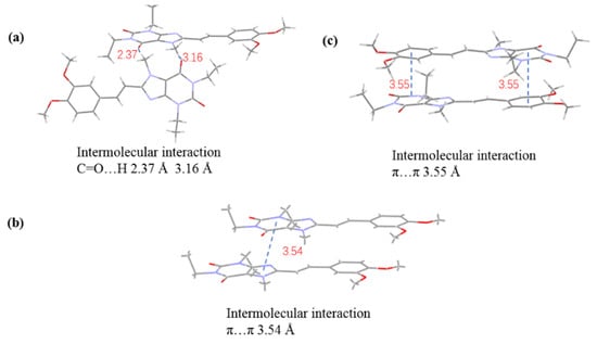 According to the crystallographic data and structure refinement parameters, three forms can be effectively distinguished. From the single-crystal structure, it can be seen that form I was pure crystal, form II was monohydrate crystal, and form III was monohydrate of acetonitrile solvent complex. The three forms were all monoclinic systems with different space groups, with form I, II and III exhibiting P21, P21/c and P21/m, respectively. The molecular packing and intermolecular interactions of the three forms were different (Figure 5). Form I has strong intermolecular hydrogen bonds between oxygen atoms and the nearby hydrogen on the other side of the molecule (C=O…H, 2.37 Å and 3.16 in form I), without π-π stacking. Form II and form III have hydrogen bonds between oxygen atoms and the nearby hydrogens of water molecules (O5=O2…H, 2.878 Å in form II and O5A=O3…H, 2.955 Å in form III). Although abundant hydrogen bonds were constructed through the interactions between water molecules and the crystal of form II and form III, their bond energies of about 15~30 kJ·mol−1 were much lower than those of general chemical bonds. This suggests that these hydrogen bonds are fragile, and the water molecules are transferred during the drying process of istradefylline. Otherwise, form II was a head-to-head π-π interaction, and form III was a head-to-tail π-π interaction. The π-π stacking interaction of form II, at 3.55 Å, was stronger than that of form III, at 3.54 Å, between two molecules. It is well-known that π-π stacking is detrimental to the solubility of compounds. Different π-π stacking forms also have an effect on solubility, which may lead to the weak solubility and dissolution of the crystalline form II of istradefylline.