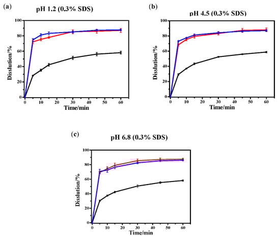 The instruments used for tablets included a circulating water vacuum pump (SHB-III, Zhengzhou Great Wall Science, Industry and Trade Co., Ltd., Zhengzhou, China), an electrothermal blast drying box (GZX-9240MBE, Shanghai Boxun Industrial Co., Ltd., Shanghai, China), an electronic balance (PB3002-S, METTLER TOLEDO), a constant-temperature magnetic stirrer (DF-101S, Zhengzhou Great Wall Industry and Trade Co., Ltd.), an ultraviolet-absorption spectrophotometer (UV1800, Shimadzu, Kyoto, Japan), a dissolution tester (SNTR-8400AT, Shimadzu), a single-stamping-sheet machine (YP-1, HangZhou XuZhong Food Machinery Co., Ltd.), and a high-efficiency coating machine (JCB/K-3/5/10, Wenzhou Jianpai Pharmaceutical Machinery Co., Ltd., Wenzhou, China, nozzle diameter of 1 mm).