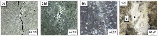 Optical images of the crack healing process over 56 days: 1—Crystals clusters (last image magnified to 80×).