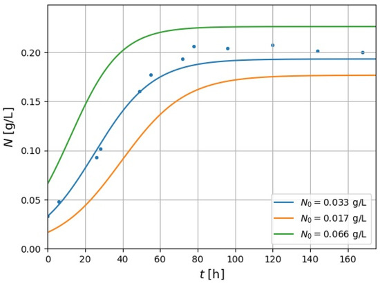 Dependence of bacteria concentration N(t) on various concentrations of the inoculate. All independent parameters (a = 60 g/L, rm = 4 h−1, γ = 0.2, and So = 0.8 g/L) were kept constant. Blue dots correspond to the experimental data.