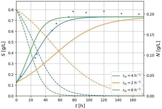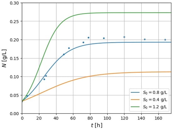 Solution (7) of the logistic equation (in the Monod formulation) was used in order to determine the sensitivity of the growth curves to various input parameters (No, So, γ, a, rm) for Bacillus pseudofirmus, grown under laboratory conditions with an initial inoculation concentration of 0.033 g/L and at a temperature of 30 °C. All modeled growth curves below correspond to the set of baseline parameters (No = 0.033 g/L, So = 0.8 g/L, γ = 0.2, rm = 4 h−1, a = 60 g/L) used in our previous, numerically oriented publication [38]. Typical growth curves for various initial concentrations of inoculate No, resp. nutrient source So are shown in Figure 3 and Figure 4.