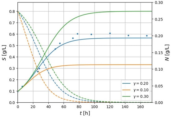 Using expression (7), one may obtain a set of growth curves representing the influence of the inner parameters γ, rm, a (with given experimental input: No = 0.033 g/L and So = 0.8 g/L) on their time evolution.
