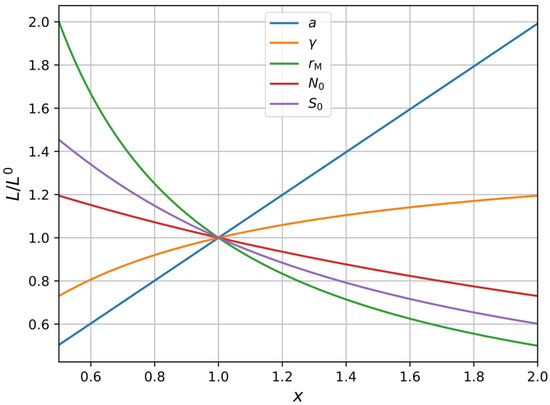 The sensitivity of the bacterial growth curves on changes of the input parameters is shown in Figure 8, where x is a given ratio of changed and unchanged parameters, where x ∈ (0.5, 2) has been applied; thus, x = 1 corresponds to the lengths L = Lo of the linearized exponential growth phase for a set of baseline parameters. As an alternative example, L(xNo, So, γ, a, rm) reflects the sensitivity of the linearized part of the exponential growth phase to the change of inoculate concentration. The figure above especially confirms the relevance of bacterial metabolic ability on the prolongation of the exponential part of growth.