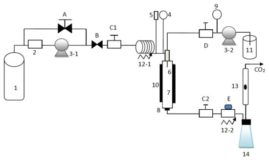 Experimental apparatus of the supercritical antisolvent process (1: CO2 cylinder; 2: cooler; 3: high-pressure pump; 4: pressure transducer; 5: thermometer; 6: nozzle; 7: precipitator; 8: filter; 9: pressure gauge; 10: heating jacket; 11: solution reservoir; 12: heating tape; 13: rotameter; 14: solvent cold trap; A: backpressure regulator; B: check valve; C: needle valve; D: ball valve; E: micro-metering valve).
