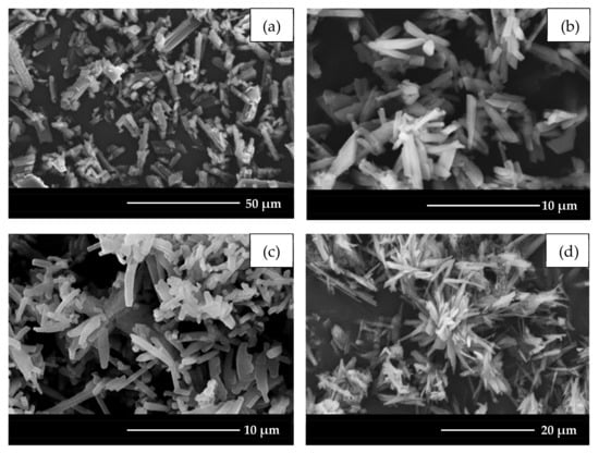 Comparison of crystal habit of unprocessed and SAS-processed allopurinol (a) unprocessed sample, (b) SAS-processed sample using NMP as the solvent, (c) SAS-processed sample using DMAC as the solvent and (d) SAS-processed sample using DMSO as the solvent.