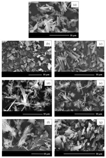 Comparison of crystal habit of SAS-processed allopurinol (a) powder from Exp. 1, (b) powder from Exp. 2, (c) powder from Exp. 4, (d) powder from Exp. 5, (e) powder from Exp. 6, (f) powder from Exp. 7 and (g) powder from Exp. 8.