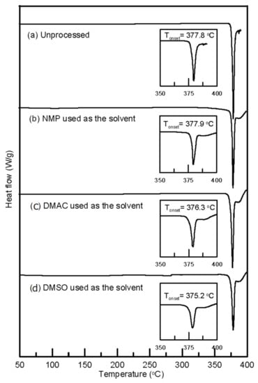 Comparison of DSC thermograms of unprocessed and SAS-processed allopurinol (a) unprocessed sample, (b) SAS-processed sample using NMP as the solvent, (c) SAS-processed sample using DMAC as the solvent and (d) SAS-processed sample using DMSO as the solvent.