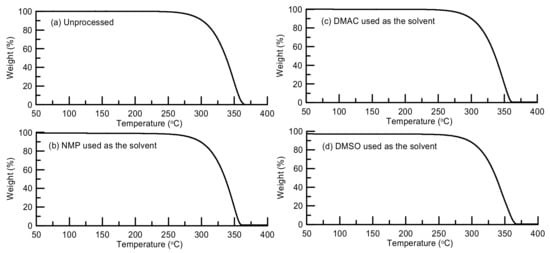 Comparison of TGA results of unprocessed and SAS-processed allopurinol, (a) unprocessed sample, (b) SAS-processed sample using NMP as the solvent, (c) SAS-processed sample using DMAC as the solvent and (d) SAS-processed sample using DMSO as the solvent.
