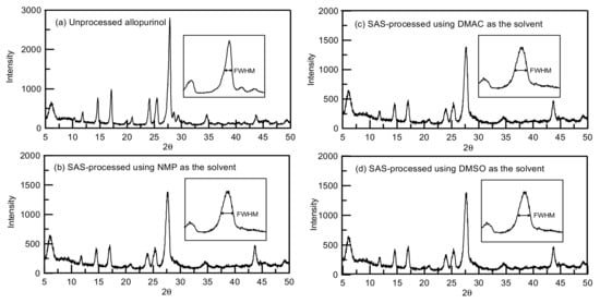 Figure 7 compares the PXRD pattern of the unprocessed and SAS-processed allopurinol. In the Cambridge Crystallographic Data Centre (CCDC) database, allopurinol has also been recognized as form I (CCDC no.:1102293), and the calculated PXRD pattern is shown in Supporting Information (Figure S2). Moreover, the crystal structure of allopurinol has also been identified as form I by Tomoda et al. []. As indicated in Figure 7, the PXRD pattern of the SAS-processed allopurinol is consistent with that of the unprocessed allopurinol and with the confirmation reported in the literature. In addition, the maximum intensity peak in the PXRD pattern is presented in a subfigure in Figure 7. As can be seen, the increase in full width half maximum (FWHM) of the maximum intensity peak for the SAS-processed sample indicates a loss of crystallinity through SAS processing. Based on the above experimental evidence, the analytical results of FTIR, DSC, TGA, and PXRD of unprocessed and SAS-processed allopurinol were compared and discussed. The crystal forms, thermal properties, and spectrometric properties were consistent before and after SAS operations.