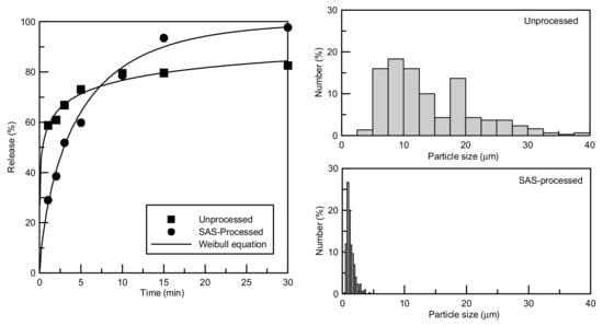 The dissolution rates of the unprocessed and SAS-processed allopurinol were finally investigated in this case study. Figure 8 illustrates the comparison of the dissolution profile and particle size distribution of unprocessed and SAS-processed allopurinol. Due to the wide range of particle size distribution of the unprocessed sample, the dissolution experiment indicates that the unprocessed sample needs a long time to completely dissolve, and the dissolution of the unprocessed sample may have a burst release phenomenon. On the other hand, the SAS processed particles with narrower size distribution can avoid the burst release and, thus, the dissolution rate can stabilize and complete in less time. The unprocessed allopurinol was dissolved for about 75% in 15 min, and the SAS-processed allopurinol was dissolved for about 90% in 15 min. However, at 30 min, the SAS-processed allopurinol was completely dissolved, and the unprocessed allopurinol was only dissolved by about 80%. In addition, the Weibull equation was also applied to correlate the dissolution profiles. The Weibull model was expressed as []:
