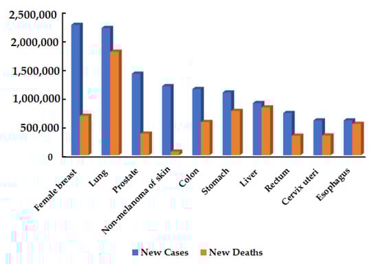 Carcinogenesis is postulated as a multistage process that is genetically regulated. The first step includes exposure of normal cells to carcinogens, which may include chemical compounds like asbestos and benzene, and drugs and hormones used for therapeutic purposes. Furthermore, physical agents such as radiation and ultraviolet light and biologic agents like viruses or pollutants can also act as carcinogens. Hereditary factors like age and gender may also play a role. Carcinogens produce genetic alterations that can result in irreversible cellular changes. The changed cell has an altered response to its environment and provides selective growth, resulting in a clonal population of cancer cells. This is followed by promotion, where carcinogens alter the environment to favor growth of the altered cell population. The last step follows, namely conversion or transformation, where the altered cell becomes cancerous. Depending on the specific cell, this process may happen over 5–20 years before development of a clinically detectable cancer [,]. Progression is the final stage in cancer development and involves further genetic alterations that lead to increased cell proliferation. This stage includes invasion into local tissues as well as the development of metastases []. Female breast cancer and lung cancer account for the highest number of new cases, while lung cancer contributes to the highest number of deaths globally, as depicted in Figure 1 [].