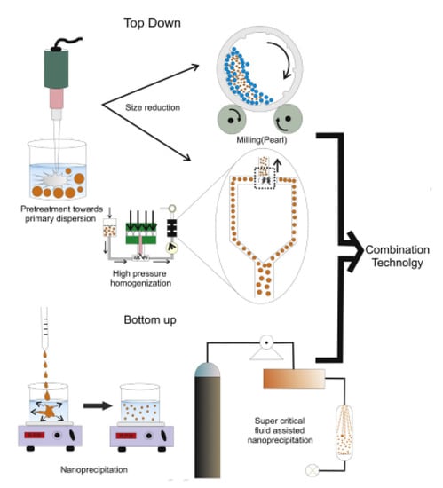 Nanocrystals and NCC can be manufactured by using top-down and bottom-up techniques with a suitable stabilizer []. Typically, top-down techniques make use of attrition forces to reduce micromolecules to nanosized crystals, while in bottom-up techniques molecular aggregation is prevented at specific size by the use of nucleation enhancers and aggregation disruptions as depicted in Figure 3 [].