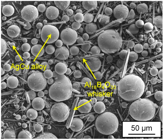 One-dimensional single-crystal materials, such as aluminum borate whisker [16] and SiC nanowire/whisker [17,18], have relatively low CTE, low lateral surface energy, and very high tensile strength (along the growth direction), and have been widely used as strengthening phases to fabricate composite materials. The low lateral surface energies of one-dimensional materials are helpful to solve the agglomeration problem when fabricating composite brazing filler metals. Particularly, the one-dimensional morphologies of the single crystals are beneficial to taking full advantage of their outstanding mechanical properties. Although TiB whiskers, which are formed in situ during the brazing process, have been used to relieve the residual stress in brazed joints [13,19,20], their distribution and size highly depended on the distribution of initial particle phases and the brazing parameters. To the authors’ knowledge, there is no report on brazing ceramics to metals by whisker-reinforced filler alloys. Directly added whiskers have great potential to optimize the microstructure of joints and then improve their mechanical properties.