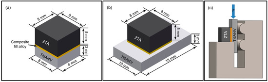 Diagrammatic sketches of (a) the joining assembly for microstructural investigation, (b) the joining assembly for shear strength test, and (c) the shear strength test process.