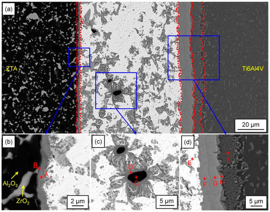 BSE SEM images of the whisker-strengthened ZTA/Ti6Al4V joint brazed at 825 °C for 10 min. (a) Low-magnification SEM image. (b–d) High-magnification SEM images corresponding to the regions marked in (a).