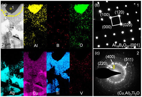 TEM characterization of the whisker-reinforced brazing seam obtained at 825 °C for 10 min. (a) STEM image and the EDS mapping results of the whisker/Ag-based alloy interface. (b,c) SAED patterns of the Al18B4O33 whisker and the (Cu,Al)3Ti3O reaction layer, respectively.