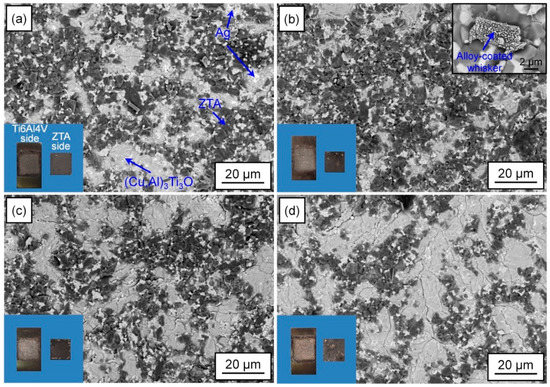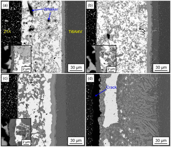 BSE SEM images of the ZTA/AgCu + ABOw/Ti6Al4V joints brazed at (a) 800 °C, (b) 850 °C, (c) 875 °C, and (d) 900 °C.