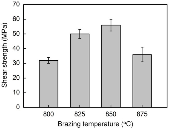 Figure 6 presents the shear strength of the ZTA/AgCu + ABOw/Ti6Al4V joints brazed at different temperatures for 10 min. It can be seen that the average shear strength of the joint fabricated at 800 °C was 32 MPa, which was 7 MPa lower than that of the joint brazed by AgCu alloy at the same temperature [10]. This was mainly because the weaker bonding of the ZTA/(Cu,Al)3Ti3O interface resulted from the consumption of Ti and Cu by ABOw at the relatively low brazing temperature. As the brazing temperature was increased, the joint strength rose to more than 50 MPa, and reached the maximum value of 56 MPa when the joining process was conducted at 850 °C. Although the maximum shear strength of the joints brazed by ABOw-reinforced AgCu alloy was only a little higher than that of the joints brazed by AgCu alloy, the range of brazing temperature that obtained a shear strength value higher than 50 MPa was extended. This extension was beneficial to the fabrication of ZTA/Ti6Al4V joints with relatively large sizes or complex shapes.
