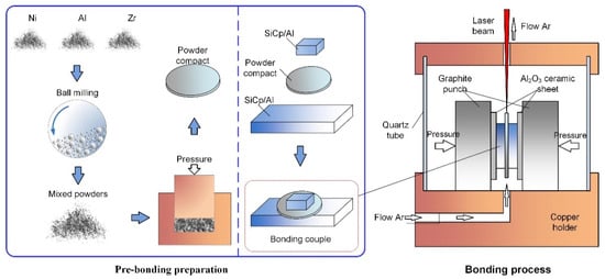 The laser-induced exothermic bonding of SiCp/Al composites was conducted under the protection of argon to avoid the adverse effect of oxygen. The joining schematic diagram is represented in Figure 2. During the bonding, the exothermic interlayer was applied between the SiCp/Al composites. A laser beam (YAG-W100E, P = 200 W, Han’s Laser Technology Industry Group Co., Ltd., Shenzhen, China) heated and ignited the interlayer. Then, the combustion flame propagated to the other side and finished the bonding process.