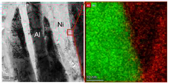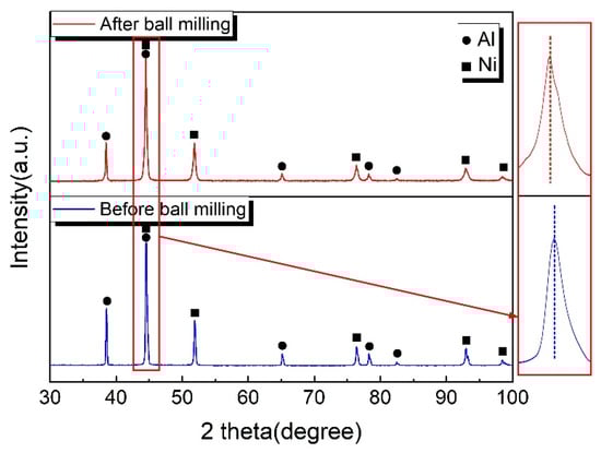 Mukasyan et al. [32] reported that the high-energy ball-milling treatment could refine the structure of the energetic materials. The fine structure can significantly decrease the ignition temperature and increase the activity of the Al/Ni composites, which is beneficial to the exothermic bonding of the SiCp/Al composites. Figure 3 shows the microstructure of the Al/Ni composites before and after the high-energy ball-milling treatment. It can be seen from the figure that the high-energy ball-milling treatment greatly changed the morphology and distribution of the Al and Ni powders. The raw powders in Figure 3a presented a spherical shape. Some particles aggregated together. After the ball-milling treatment, a large deformation occurred in the particles, forming the Al/Ni composite particles. Within the Al/Ni composite particle, a clear lamellar structure was observed. The white and dark-gray layers were Ni and Al, respectively. To examine the effect of the ball-milling process on the Al/Ni interface, the TEM analysis was employed. Figure 4 shows the TEM figure of the Al/Ni composite particle. The lamellar structure was clear. The thicknesses of the Ni and Al layers ranged from 50 nm to 200 nm. To discover more details, the Al/Ni interface was enlarged. The corresponding elemental mapping figure indicated the Al/Ni interface was sharp. Only a narrow Al-Ni mixed zone was detected, which meant that no chemical reactions occurred between the Al and Ni. Figure 5 shows the XRD results of the Al/Ni powders before and after the ball-milling treatment. Only Ni and Al peaks were detected in the curves. It should be noted that after the ball-milling treatment, the locations of the peaks shifted slightly to the left, which was due to the refinement of the materials.