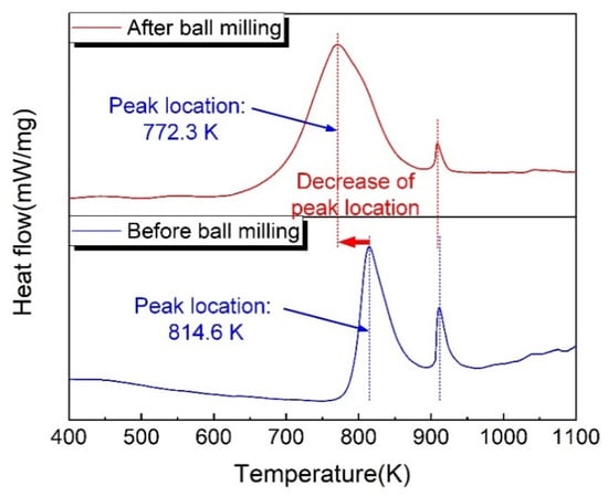 The above analysis indicated that after the ball-milling treatment the Al-Ni mixed powders transformed into the nanostructured Al/Ni composites. In general, the refinement of the structure in the Al/Ni composites was beneficial to the exothermic properties of the materials [33]. This was because, during the reaction, the fine lamellar structure decreased the atomic diffusion distance and increased the reaction rate [34]. Compared with the original mixed powders, the fabricated nanostructured Al/Ni energetic materials not only had a fine lamellar structure but also had a uniform distribution of the Al and Ni, which all made the exothermic reactions occur more easily. Figure 6 shows the DSC curves of the Al/Ni energetic composites. There were two exothermic peaks in the DSC curves. The first peak was the main exothermic peak, which was due to the solid-state diffusion between the Al and Ni. After the ball-milling treatment, the location of the first peak shifted to a low temperature. The decrease in the peak location was about 42 K. This phenomenon was caused by the refinement of the structure. At low temperatures, the solid-state diffusion between the Al and Ni was enhanced due to the formation of the nanostructure. The second peak was due to the melting of the Al. After the ball-milling treatment, the location of the second peak did not change. The change in the main exothermic peak location meant that the fabricated nanostructured Al/Ni energetic materials had a high activity, which may be beneficial to the bonding process.