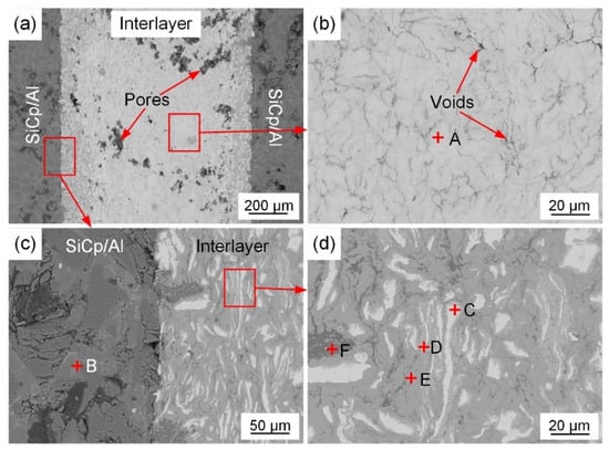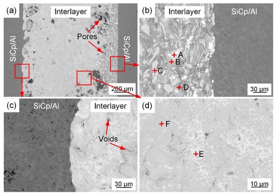 Figure 9 shows the microstructure of the joint bonded with the Al/Ni/Zr interlayer. It can be seen that the addition of Zr improved the bonding quality. Compared with the joint in Figure 7, the pores and the cracks were obviously reduced. This was mainly because the Zr addition transformed the interlayer products from Ni-Al to the eutectic mixture of NiAl + Ni-Al-Zr. The eutectic products had a lower melting point than the NiAl, thus prolonging the exitance of the liquid phase. Under the effect of bonding pressure, the interlayer products could be densified more easily, leading to a decrease in the pores and cracks in the joint. To detect more details, different zones in the joint were enlarged. Figure 9b,c show the microstructures at the bonding interface. It can be seen in the figures that the interlayer products bonded well with the SiCp/Al composites. However, the interlayer products on the two sides were different. The interlayer products in Figure 9b were a mixture of bright phase (Position A), light-gray phase (Position B), gray phase (Position C), and dark-gray phase (Position D), while the interlayer products in Figure 9c were the same as the interlayer products in Figure 9d. This phenomenon was mainly due to the different heat transfer conditions on the two sides. As introduced in Section 2, the dimensions of the SiCp/Al pieces were different. The SiCp/Al composites in Figure 9b were larger than those in Figure 9c, thus absorbing more heat. The SHS reaction was quenched, forming the unreacted products on this side.