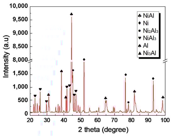 The Al/Ni nanostructured energetic materials were cold-pressed into a powder compact and served as the exothermic interlayer to bond the SiCp/Al composites. Figure 7 shows the microstructure of the joint bonded under a pressure of 4 MPa. After being ignited by the laser beam, the SHS reaction occurred. The interlayer products bonded well with the SiCp/Al composites. Due to the particularity of the SHS reaction, some pores were unavoidably formed in the joint. To discover more details, the zones in the interlayer products and near the bonding interface were enlarged. Figure 7b shows the microstructure of the interlayer products in the joint center. It indicates that the Al/Ni interlayer reacted completely, forming the white-gray products (Position A). Unlike the morphology in Figure 7b, the interlayer products near the bonding interface demonstrated a different morphology. The exothermic reactions near the bonding interface were incomplete, forming a mixture of bright phase (Position C), off-white phase (Position D), and light-gray phase (Position E). The incomplete reactions were mainly due to the cooling effect of the SiCp/Al composites, which absorbed the reaction heat and partially quenched the SHS reaction. In the SiCp/Al composites near the bonding interface, some light-gray phases (Position B) were also produced. An EDS analysis was performed on each region of the joint. The analysis results in Table 1 show that the phases in the interlayer products consisted of Ni and Al. According to their Ni/Al ratios, the white-gray phase (Position A), bright phase (Position C), off-white phase (Position D) and light gray phase (Position E) were supposed to be NiAl, Ni-rich Ni3Al, Ni2Al3, and NiAl3, respectively. The light-gray phase in the SiCp/Al composites was confirmed to be NiAl3, which was formed due to the diffusion of Ni. The gray phase (Position F) was the melted aluminum matrix. To further identify the phase composition of the joint, the XRD test was carried out on the interlayer products. The results in Figure 8 indicate that the interlayer products were a mixture of the Ni, Al, NiAl3, Ni2Al3, Ni3Al, and NiAl, which proved the above expectation.
